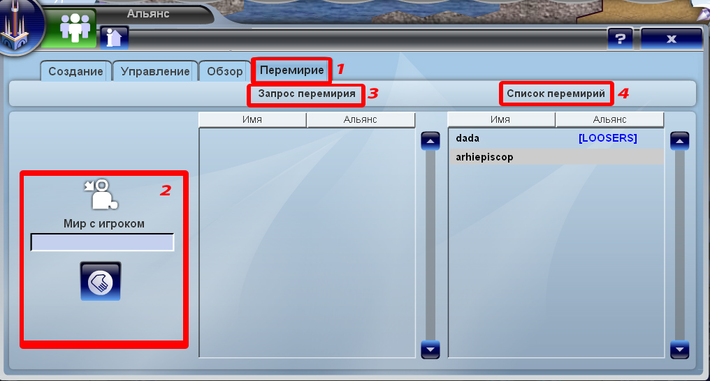 Если Вам был послан запрос на перемирие, вы увидите его в поле (3), кроме того, Вам придет уведомление о запросе в игровую почту.
