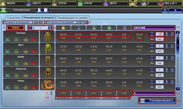 Поле (10) показывает максимальный продовес, на который вы можете реинкарнировать. Суммарные значения можно увидеть в поле (11), там показывается сумма по значениям полей (6), а в поле (12) дублируется информация о том, сколько сейчас доступно ресурсов на соте (чтобы было удобно сравнивать). В поле (12) будет показан суммарный продовес выбранного вами набора, а чтобы отправить юнитов в очередь на реинкарнацию, надо нажать кнопку (13).