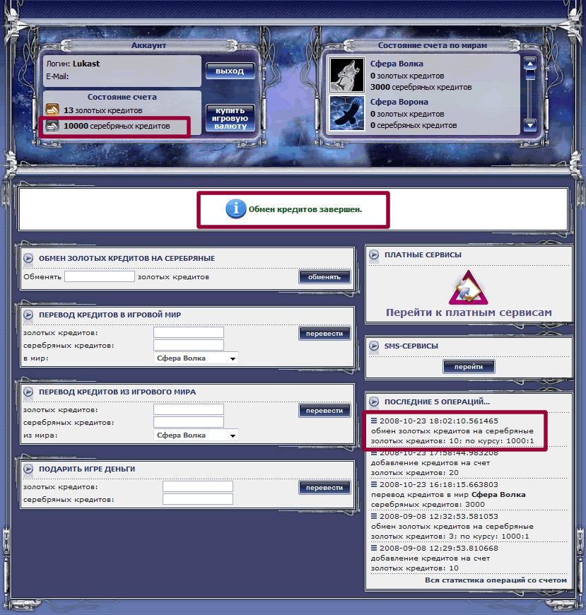 Опять куча записей и уведомлений, но желаемые 10 000 серебрянных момент были переправлены после всех манипуляций в Сферу Волка. Общая сумма 13 000 серебрянных монет и я уверен, что сейчас скуплю полсферы! Вперед, за покупками!