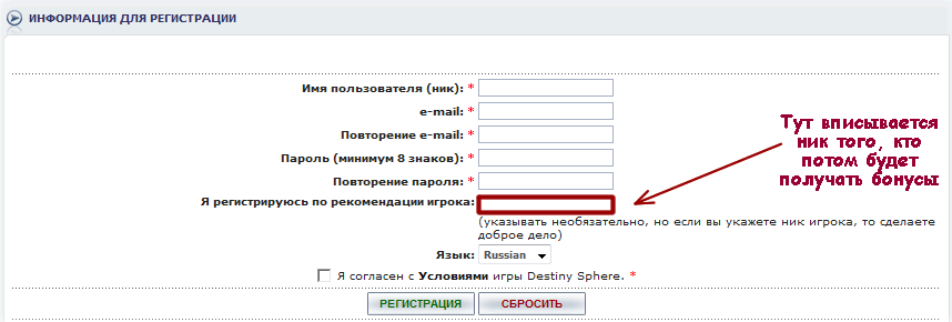 Регистрация в бесплатной онлайн игре Destiny Sphere Classic
